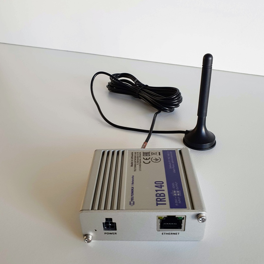 igb2,em2, etc.). - Teltonika TRB140: With power adapter and LTE antennas attached.